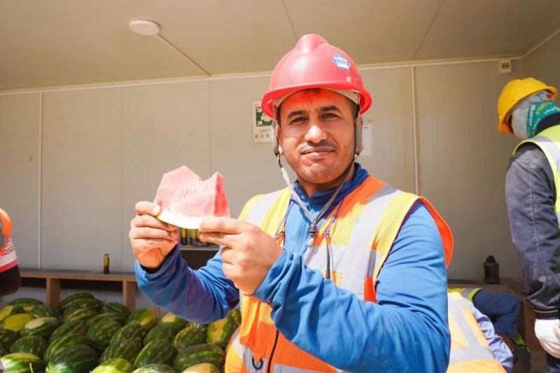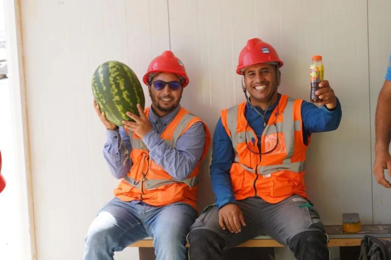盡管高溫炙烤,項目現(xiàn)場的工人們?nèi)詧允匾痪€、不畏酷暑、辛勤工作,確保工程建設的順利進行。此次,摩洛哥項目組為施工人員準備了500瓶酸奶、500瓶涼茶、2000斤西瓜等防暑降溫物品,按各單位人數(shù)送至施工現(xiàn)場分配發(fā)放。